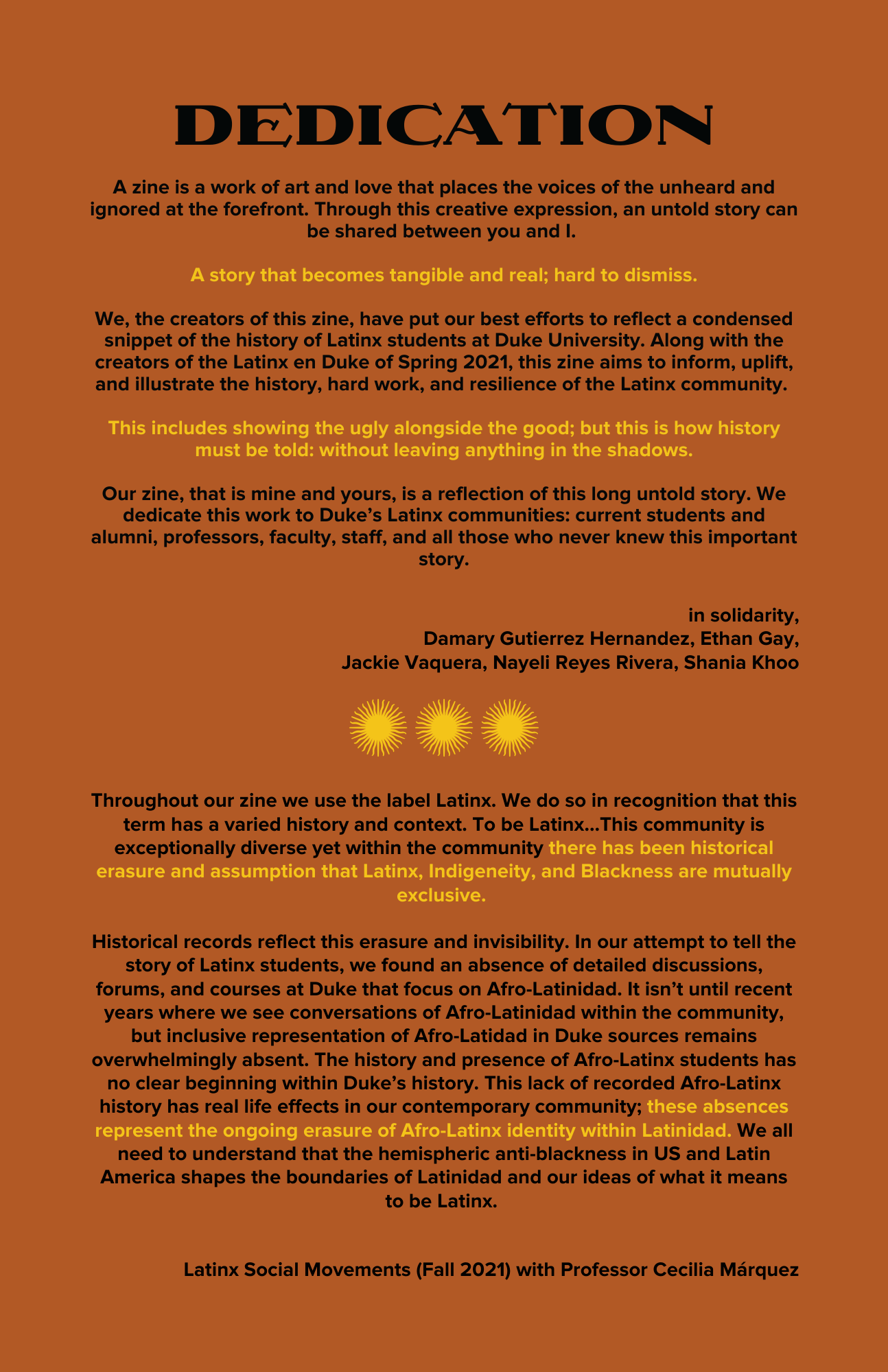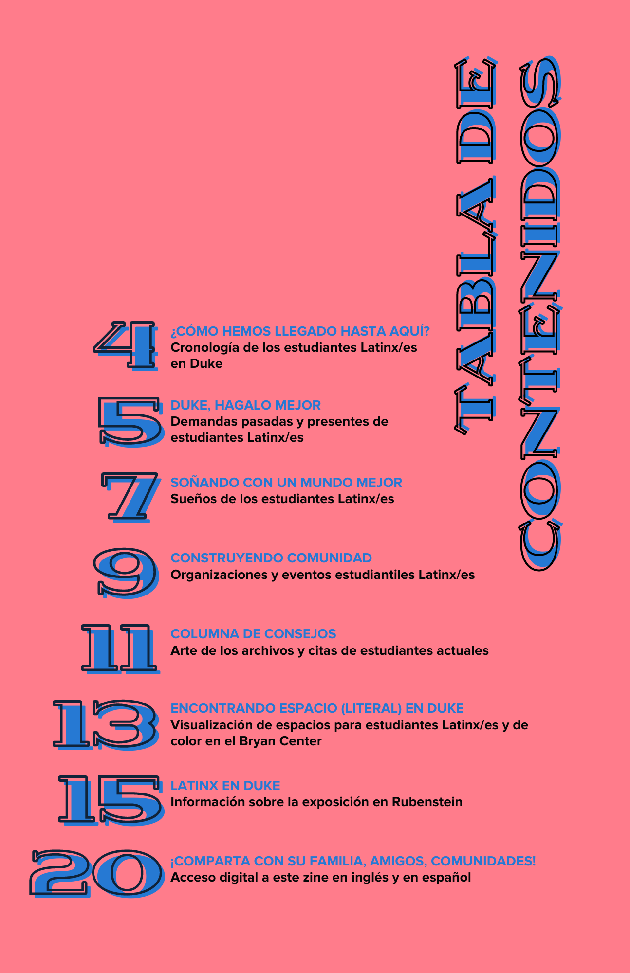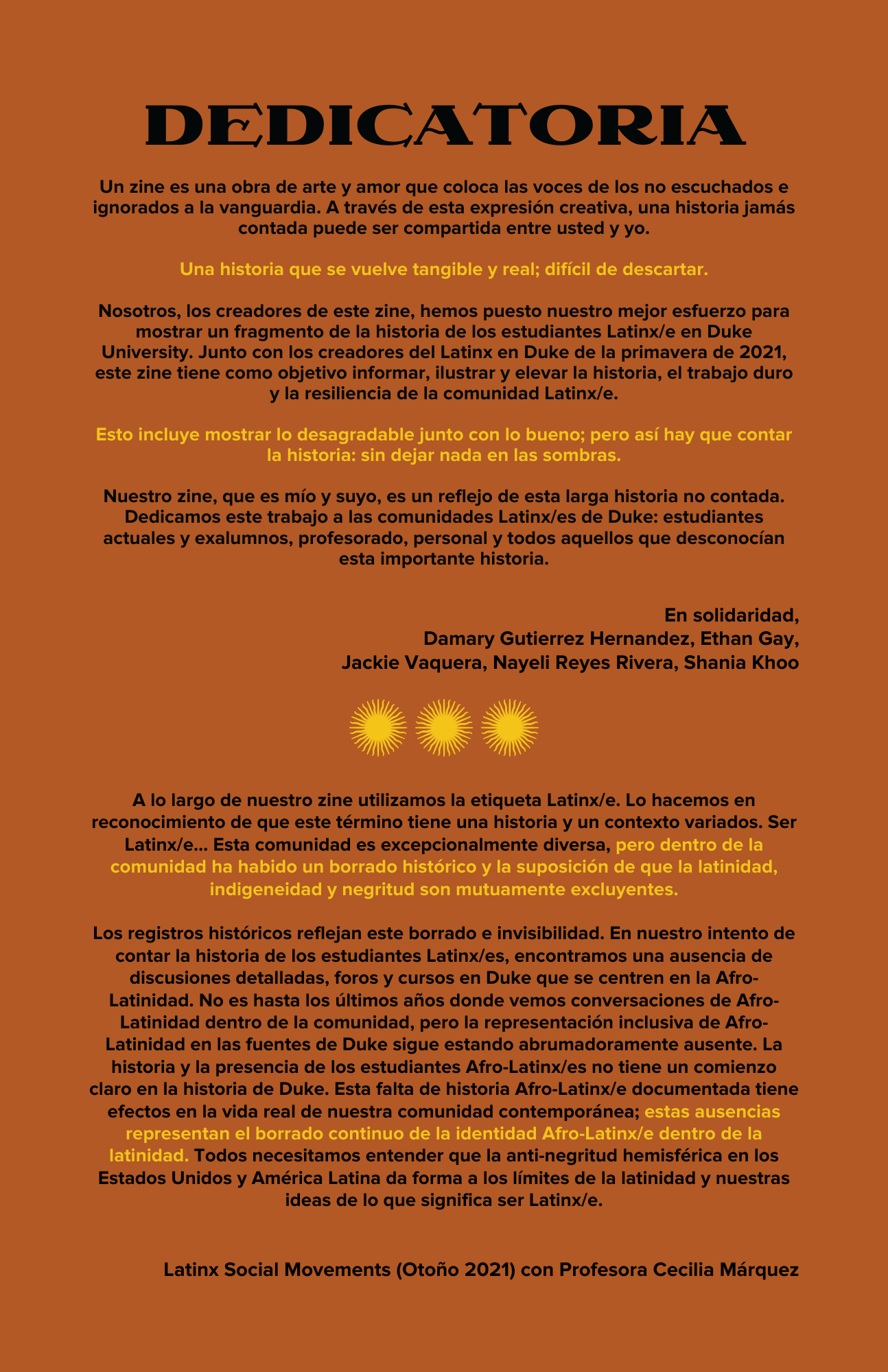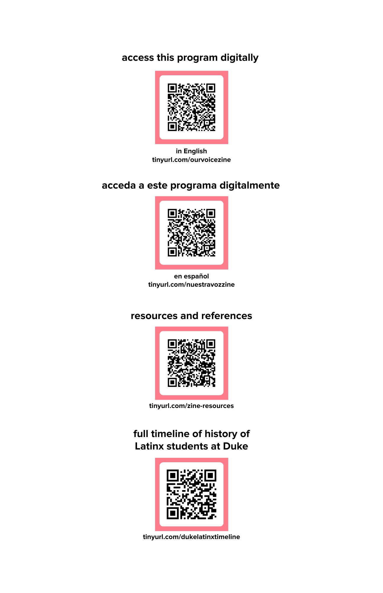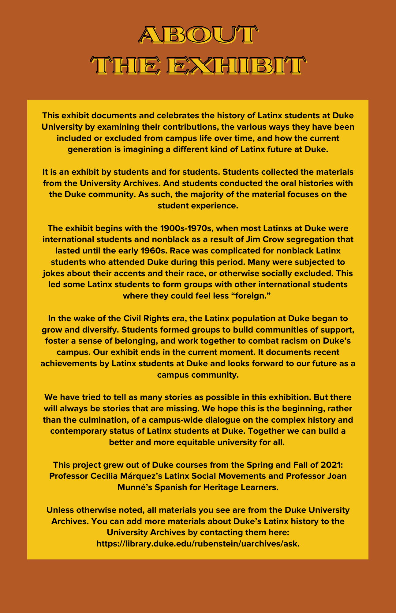 A companion zine and additional information for the Latinas/os/es/x en Duke exhibit in Chappell Family Gallery, Perkins Library, Duke University, Spring 2022.